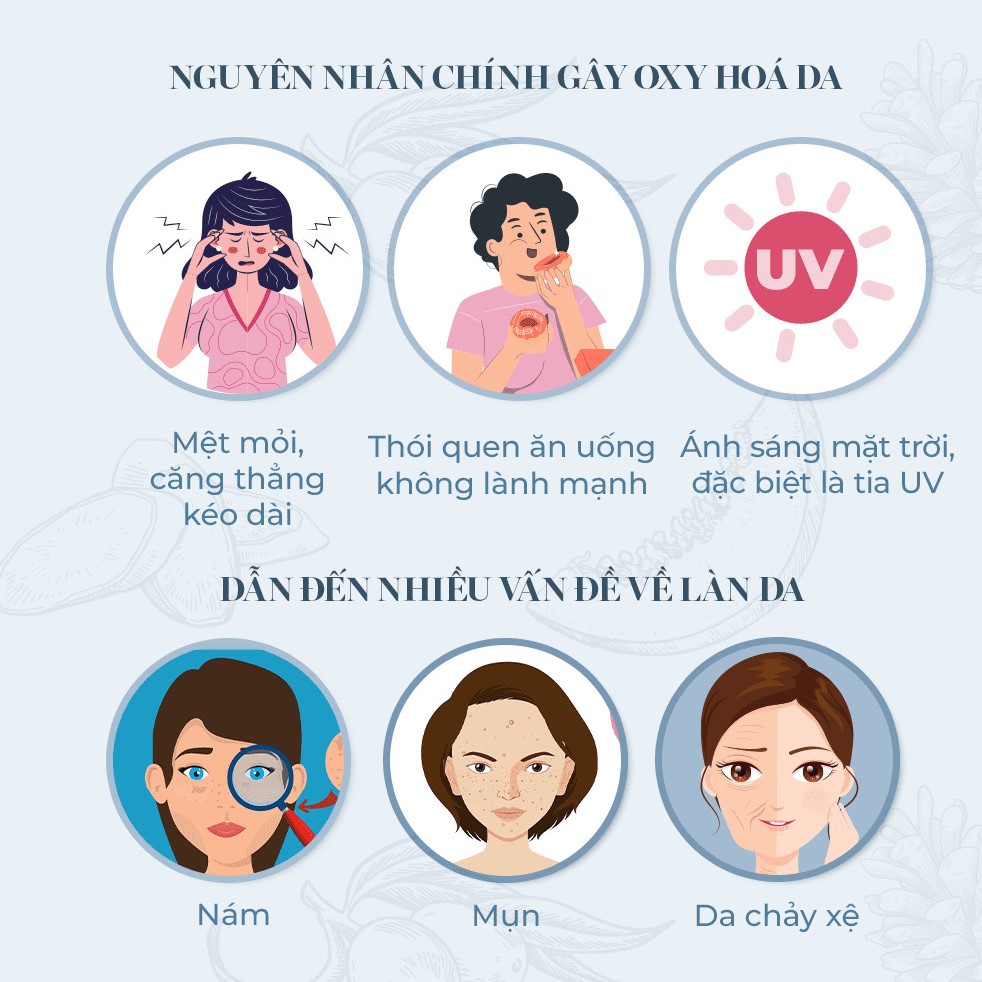 Quá trình oxy hóa diễn ra quá mức và trở nên mất kiểm soát do không đủ chất chống oxy hóa để ngăn chặn, có thể dẫn đến nhiều vấn đề về làn da.